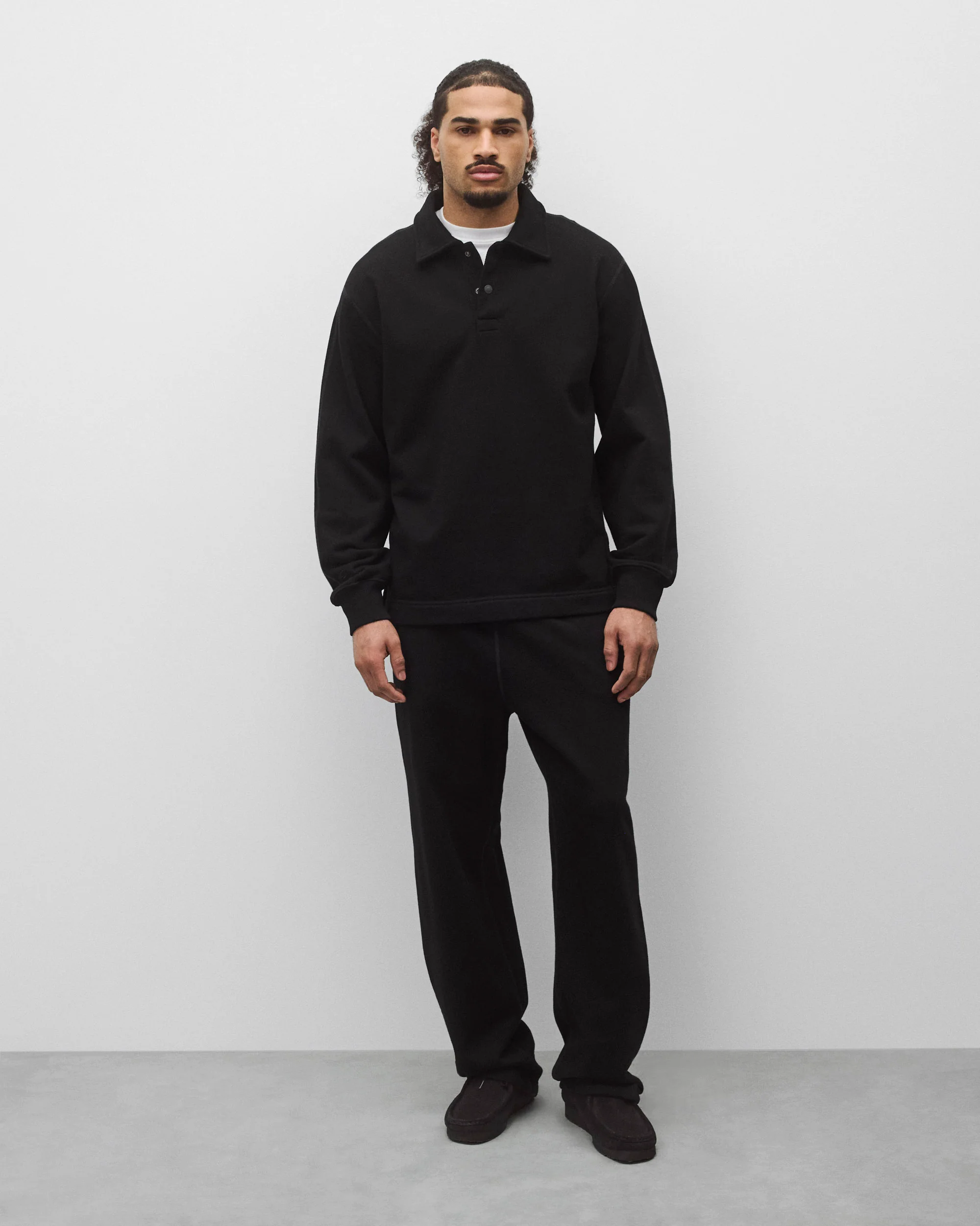 This Midweight Terry rugby sweatshirt is hand-dyed in Kyoto by Japanese artisans who have worked with only one colour since 1915. Their ecological dyeing technique is the result of four generations in pursuit of the world's deepest shade of black. This garment features a standard fit, with signature construction details and tonal woven labels.